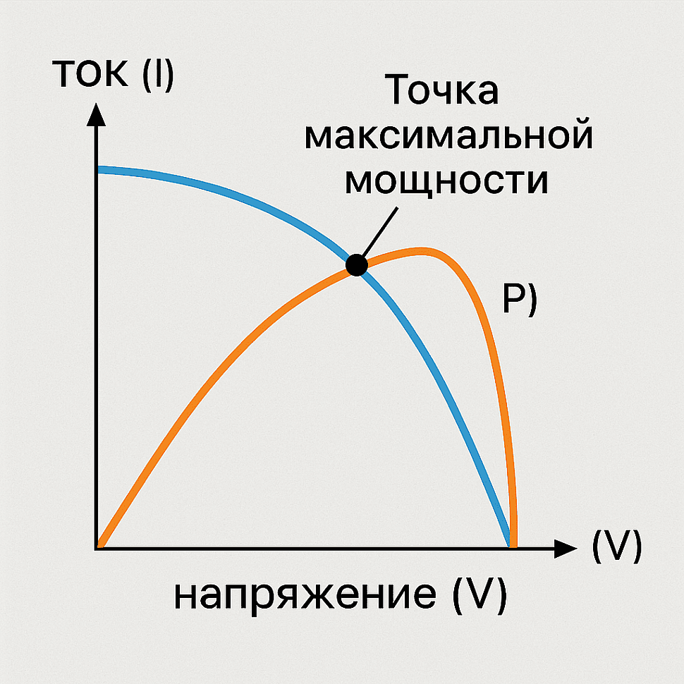 - MPPT — это динамическое отслеживание этого пика с помощью изменения нагрузки DC–DC преобразователем, что обеспечивает максимальную производительность системы в любых условиях.