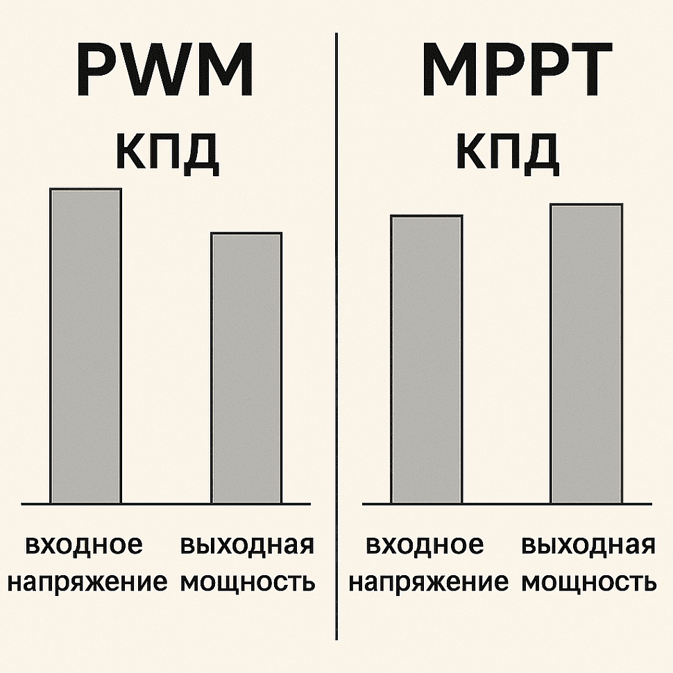 Высококачественные MPPT-инверторы обеспечивают КПД до 95–99 %, тогда как PWM-контроллеры — около 70–80 %. - Алгоритм MPPT