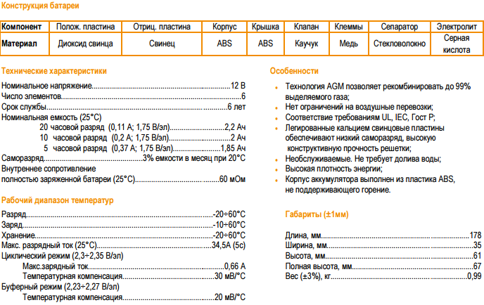 Ёмкость АКБ (С20), Ач | 2.2 |