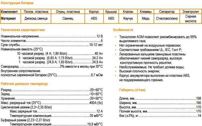 Номинальное напряжение АБ, В | 12 |