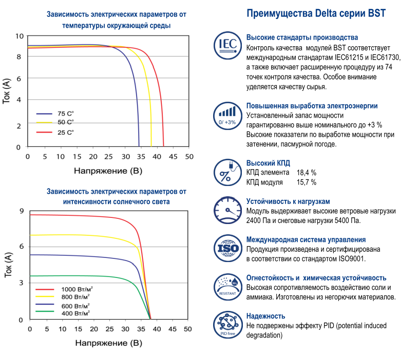 Солнечные модули DELTA серии BST выполнены из материалов экстра-класса, обладают повышенной устойчивостью к негативным факторам связанным с работой при высоких температурах, включая устойчивость к температурному токовому провалу.